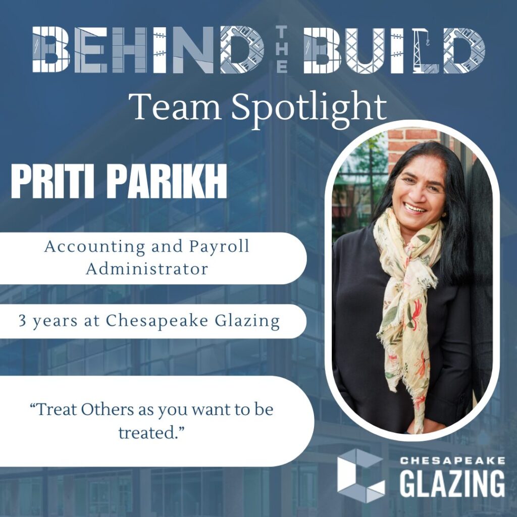 Behind every successful project is a team working both in the field and behind the scenes. At Chesapeake Glazing, one of the people helping keep everything running smoothly is Priti Parikh.