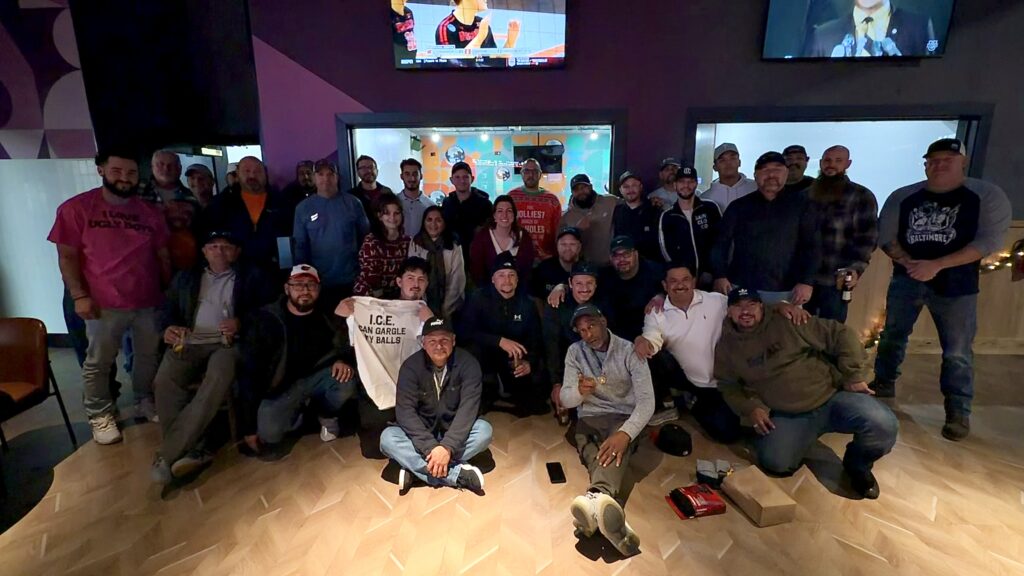 The team celebrating our annual Christmas party at Dave & Buster’s, organized with care by Priti.