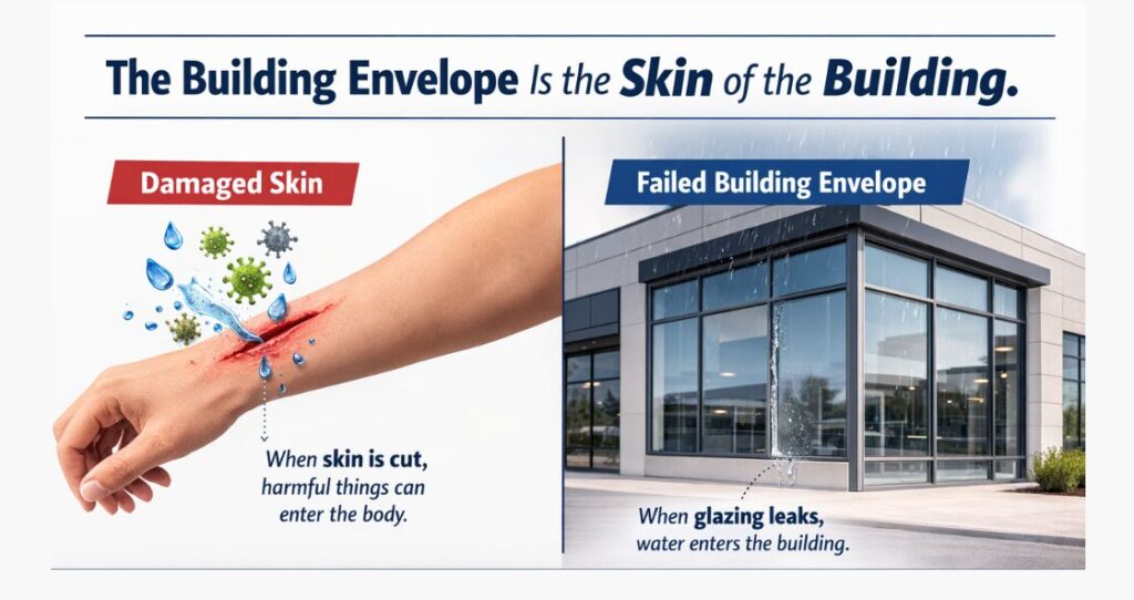 The building envelope forms the barrier between the exterior environment and the interior of the structure. It controls the movement of water, air, and temperature while protecting the building and the systems within it. One useful way to think about the building envelope is as the skin of the structure, similar to the skin of the human body. When properly installed and maintained, it protects the building from environmental exposure. When human skin is compromised, it allows bacteria and infection to enter, the same is true for a building skin, but the bacteria come in the form of water and air.