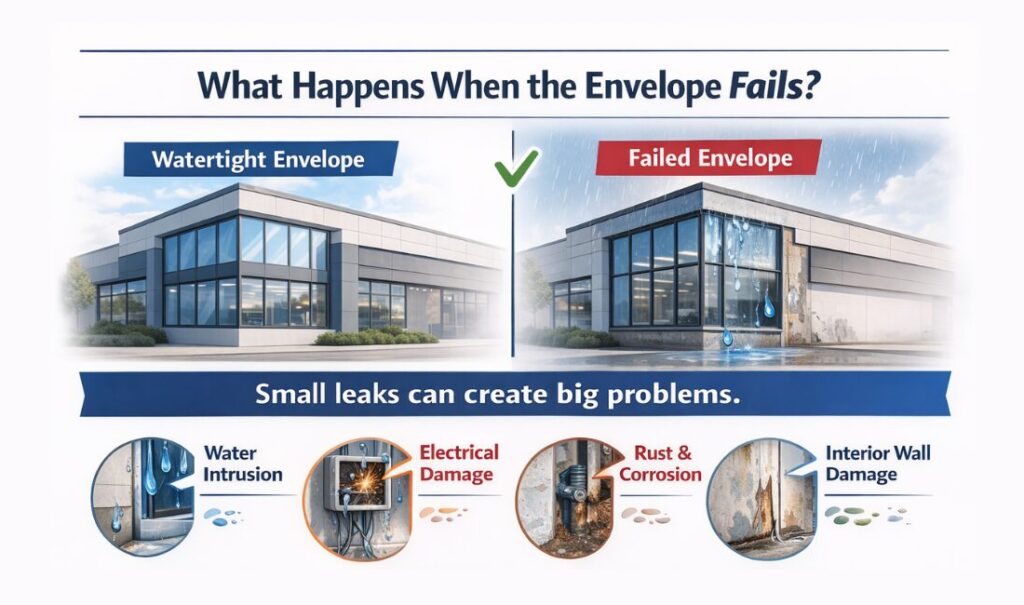 Water intrusion is rarely isolated to a single location. Once moisture enters the building envelope, it can begin affecting surrounding materials and assemblies. Over time, this can lead to corrosion of metal components, deterioration of wall systems, damage to interior finishes, and potential electrical complications.